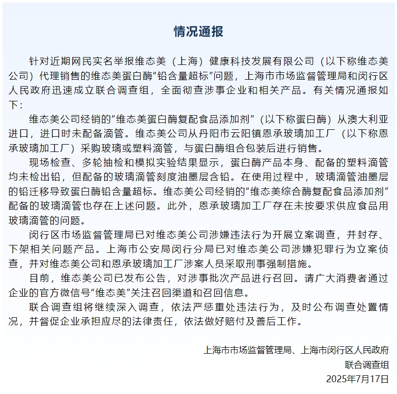 0 07-19 20:19上海市场监督管理局通报维态美公司涉嫌违法行为相关调查情况