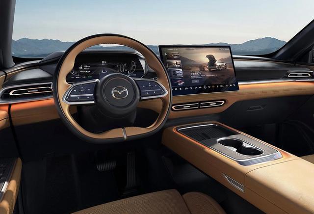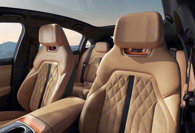 全新马自达EZ-6车内依旧走在了时代的最前沿,保留了该有的空间感、时尚感、科技感。车顶加入了全景星穹天窗,配合着四周大尺寸玻璃,为车内提供了足够的采光。车内采用了大面积Nappa真皮材质、皮革材质以及翻毛皮拼接材质,还加入了橙色的装饰面板、亮黑色钢琴烤漆装饰板以及大量银色金属元素的点缀,工艺精美,质感柔软细腻,也显得更加高级。配备14.6英寸悬浮式中控屏(搭载8155芯片)、10.1英寸的彩色全液晶仪表和50英寸的AR-HUD,采用“驾驶员中心”布局,中控台向驾驶员侧倾斜6度。车内还会搭载14扬声器索尼音响系统、64色氛围灯,还支持13种场景模式切换以及全景天幕等配置,并具备四音区语音唤醒,可支持一次性执行多条命令。