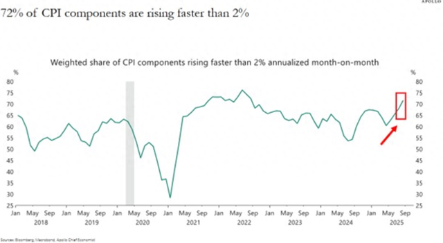数据显示,目前占美国CPI指标72%的要素商品,其价格上涨速度已经超过了美联储2%的目标值,这一比例是三年来最高的。